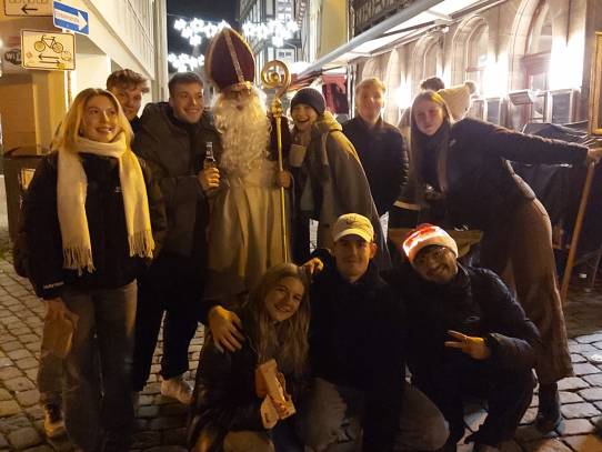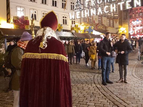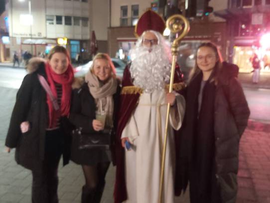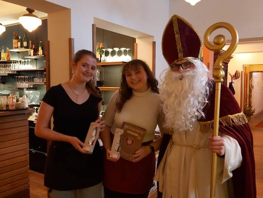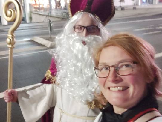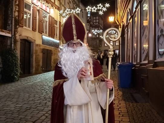 Von dem ein oder der anderen waren die Schuhe tatsächlich geputzt. Am 6. Dezember machte sich der Heilige Nikolaus gemeinsam mit seinem helfenden Engeln auf Kneipentour durch Marburgs Oberstadt. Er wollte in diesem Jahr den Nachtschwärmerinnen und Nachtschwärmern von Marburg auf den Straßen und in den Restaurants begegnen. Natürlich kam er traditionell nicht mit leeren Händen. Gemeinsam mit den Gästen wurde um Freigetränke und kleine Aufgaben würfeln und so seinen Ehrentag ein wenig anders als gewohnt gefeiert. "Die Botschaft des Heiligen Nikolaus ist nicht nur für kleine Kinder relevant", beschreibt Claudia Plociennik, Referentin für Citypastoral in Marburg und Organisatorin der Aktion das Vorhaben, "Teilen, Nächstenliebe und Hoffnungsbringer sind wichtige Themen für klein und groß." Und natürlich sollte die Aktion Freude schenken und verbreiten.
