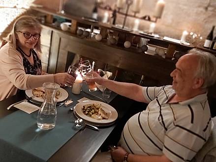 79 € für zwei Personen (inklusive Apéritifs zur Begrüßung, Drei-Gänge-Menü und Wasser)